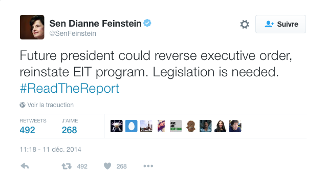 Ces commentaires déclenchèrent la colère de Feinstein, qui se tourna vers Twitter –alors que Brennan était encore en train de parler– pour contester en temps réel chaque point de son discours. «Le futur président pourrait inverser l’ordre de l’exécutif, réintroduire le programme [de techniques d’interrogatoire renforcé]. Un dispositif législatif est nécessaire», écrivit-elle dans un tweet.
