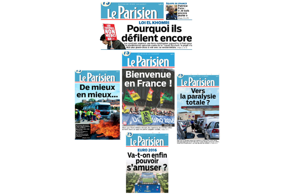 Le Parisien n’est pas en reste, mais dans un autre registre : la crainte des mobilisations. On se souvient, au moment du mouvement de 2016 contre la Loi Travail, de toute la bienveillance du quotidien envers les grévistes et les manifestants. Petit piqûre de rappel en images :