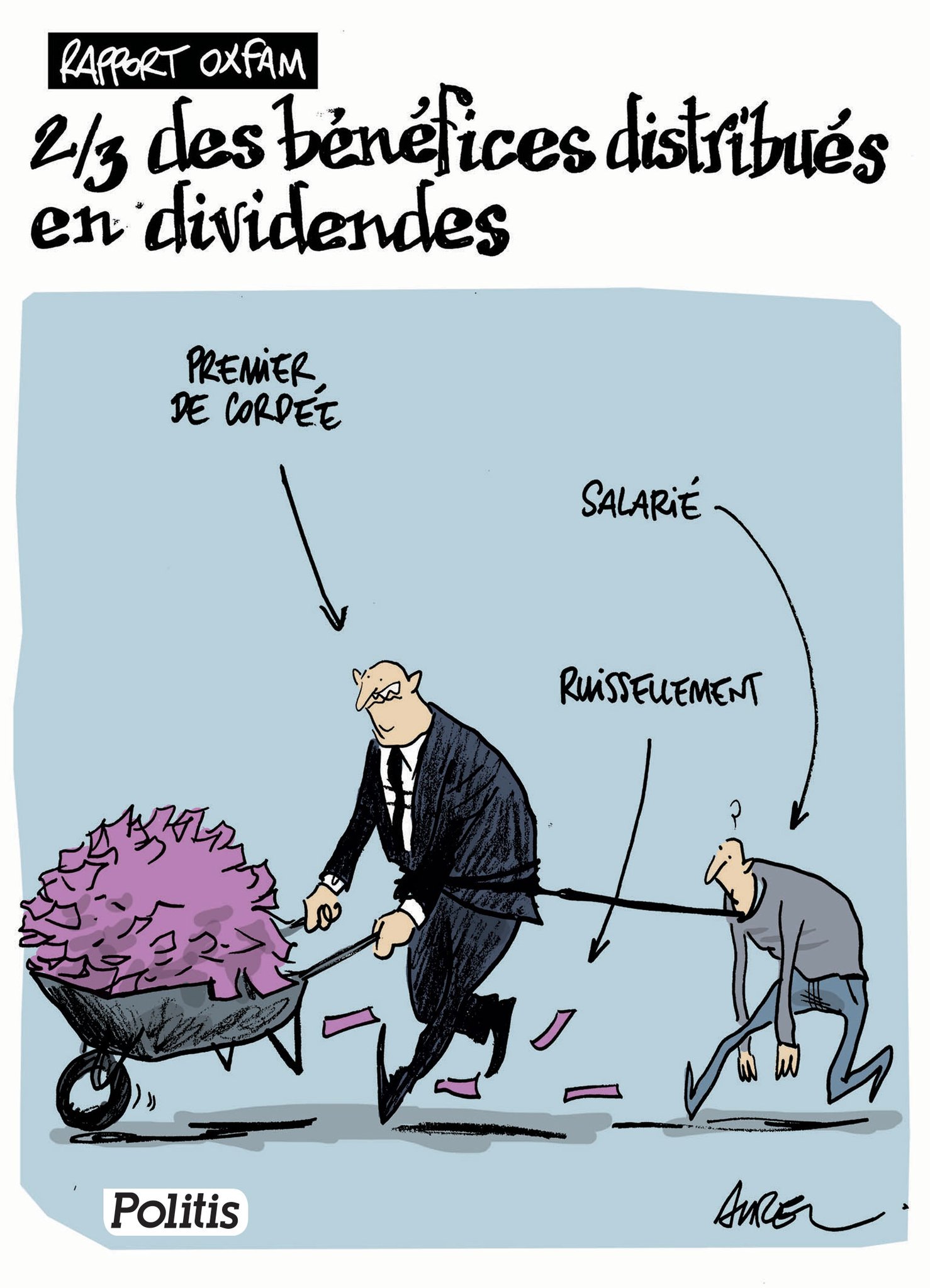 #PartageDesRichesses #CAC40 Depuis 2009, deux tiers des bénéfices des entreprises du CAC 40 ont été captés par les actionnaires sous la forme de dividendes. Et pourtant, certains font toujours semblant de croire au #Ruissellement (dessin de @Coolstand pour @politis_fr)