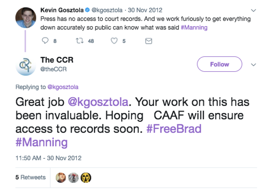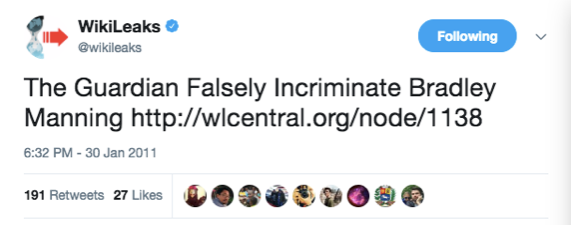 Beaucoup de citoyens courageux, de journalistes et d’ONG qui ont apporté un soutien décisif à Manning dans ces premiers temps ont été oubliés, comme par hasard. Mais en particulier, l’histoire de Twitter montre que la rédactrice en chef de FireDogLake, Jane Hamsher, le journaliste Kevin Gozstola, et une foule de bénévoles et de partisans satellites de WikiLeaks se sont surpassés année après année au profit de Manning.