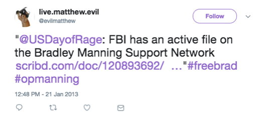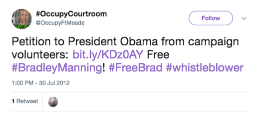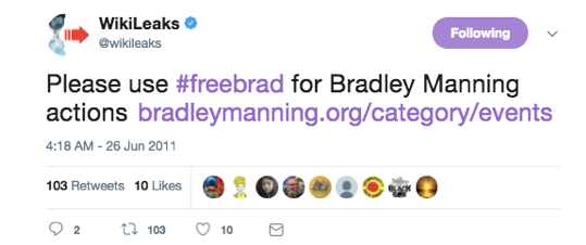 Une fois que WikiLeaks a commencé à diffuser le hashtag #freebrad, il s’est rapidement transformé en d’innombrables milliers de tweets. Il m’a fallu plusieurs heures pour lire l’histoire du hashtag de 2011-2013. Le simple volume de contenu est impressionnant.