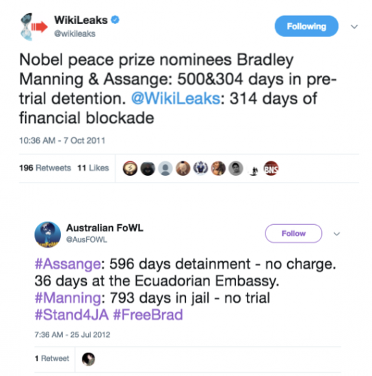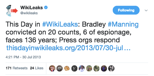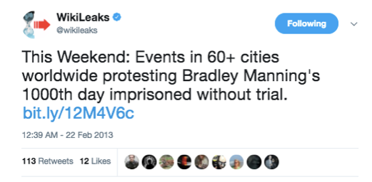 Au total, le compte Twitter principal de WikiLeaks a envoyé plus de 800 tweets en faveur de Chelsea Manning entre la date de son arrestation en 2010 et la date de sa condamnation en 2013. Le décompte ne comprend que les tweets contenant le terme de recherche du nom sous lequel elle était connue à l’époque, et seulement jusqu’à la fin de son procès. Les références à elle en tant que Pfc [private first class, grade dans l’armée américaine, NdT], ou similaire, n’ont pas été incluses dans la recherche, et donc dans le calcul du total. Il y a eu d’innombrables centaines d’autres tweets de soutien par WikiLeaks depuis.
