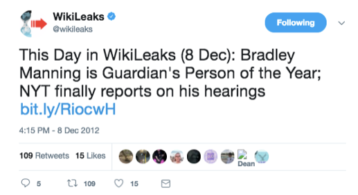 WikiLeaks ne manque jamais une occasion de remporter une victoire ironique : fin 2012, ils encourageaient les gens à voter pour Manning afin de devenir la personne de l’année du Guardian. Bien sûr, ils ont réussi à obtenir suffisamment de soutien pour elle, et elle a gagné :