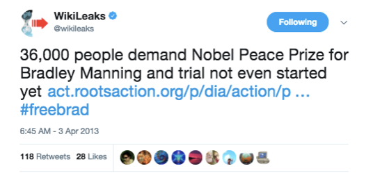 En avril de la même année, Manning était de nouveau en lice pour le prix Nobel de la paix, cette fois nominée par 36 000 partisans :