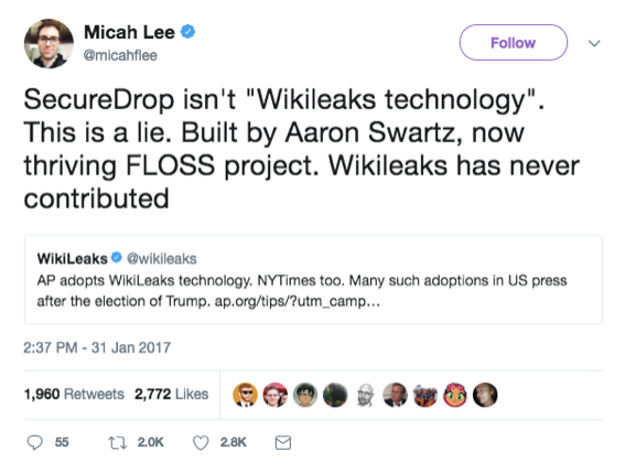 Micah Lee a déclaré ouvertement que SecureDrop – qui a acquis un référentiel de Github[un stockage centralisé et organisé de données, NdT] du projet préexistant de Swartz connu sous le nom de DeadDrop, puis l’a renommé – était un moyen de rendre accessible à tous une technologie du type WikiLeaks :