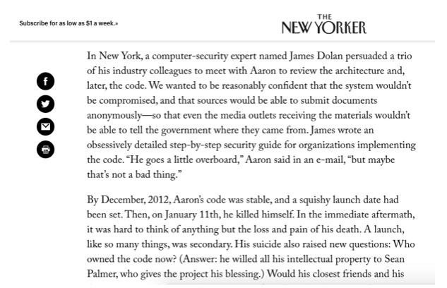 Comme par hasard, la notice nécrologique de M. Poulsen sur Swartz ne contient aucune référence à l’organisation du lanceur d’alerte. (Poulsen a une longue et acrimonieuse histoire avec WikiLeaks, car ce dernier croit que son adaptation des récits du journal de discussion Lamo-Manning avait pour but direct de mettre WikiLeaks en accusation par association). Il n’y a pas non plus de mention de WikiLeaks dans la nécrologie écrite par Cory Doctorow dans Boing Boing.