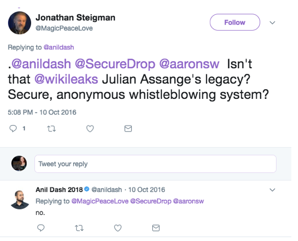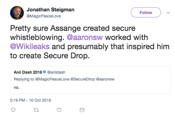 Les faits sont on ne peut plus clairs : comme le dit Aaron, WikiLeaks était la raison pour laquelle les salles de rédaction voulaient avoir accès à la même technologie. Comme Micah l’a dit, SecureDrop apporterait la technologie WikiLeaks au monde entier. Comme Kevin Poulsen l’a décrit dans le New Yorker, il avait besoin d’Aaron pour le faire, et l’a contacté via James Dolan.