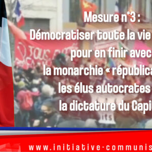 Mesure n°3 : Démocratiser toute la vie publique pour en finir avec la monarchie « républicaine », les élus autocrates et la dictature du Capital Situation : L’arasement croissant des libertés publiques et démocratiques Le 23 janvier 2020, Macron s’emporte : « Aujourd’hui s’est installée dans notre société, et de manière séditieuse par des discours politiques, l’idée que nous ne serions […]